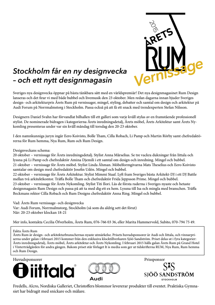 Sveriges nya designvecka öppnar med en världspremiär! Nya designmagasinet Rum Design lanseras och det firas med både bubbel och livemusik den 23 oktober. Dagarna innan bjuder Sveriges design- och arkitekturpris Årets Rum på vernissager, mingel, styling, debatter och samtal om design och arkitektur på Audi Forum, Norrmalmstorg i Stockholm. Passa på att få ett snack med trendexperten Stefan Nilsson.