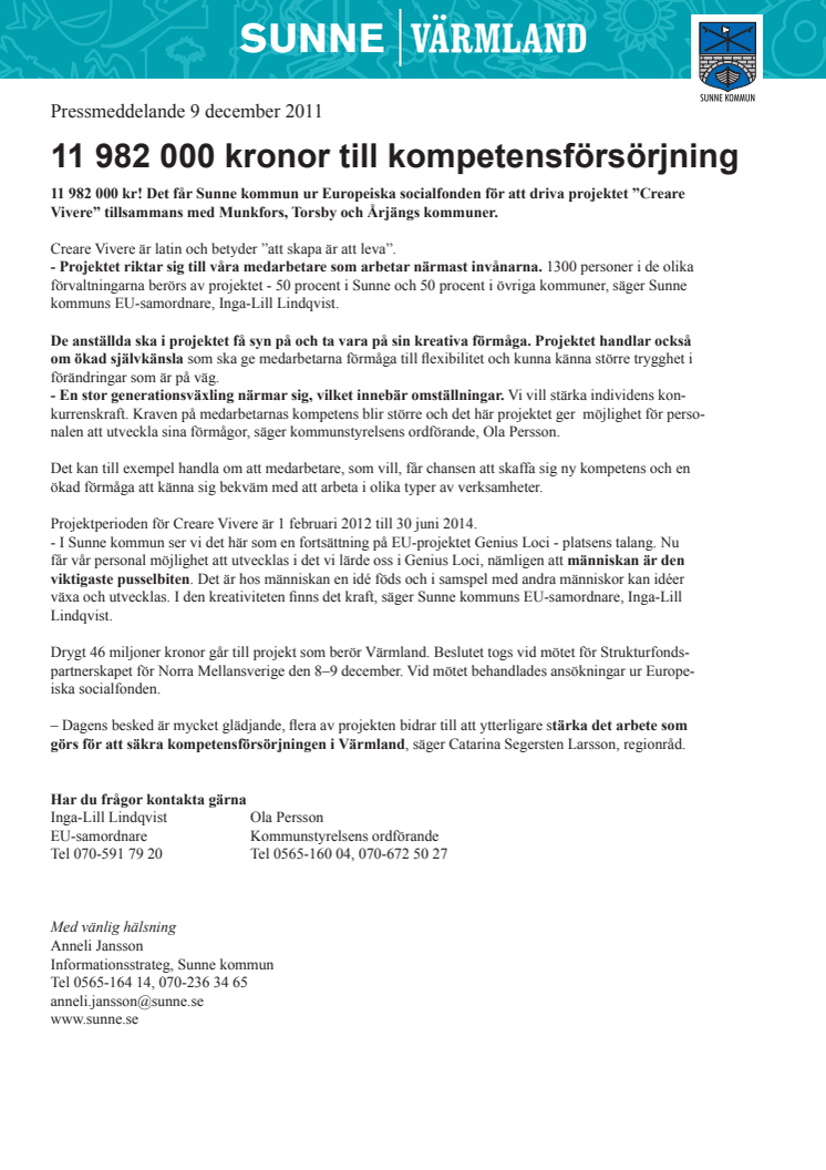 11 982 000 kronor! Det får Sunne kommun ur Europeiska socialfonden för att driva projektet "Creare Vivere" tillsammans med Munkfors, Torsby och Årjängs kommuner. Projektet riktar sig till 1300 medarbetare som arbetar närmast invånarna.