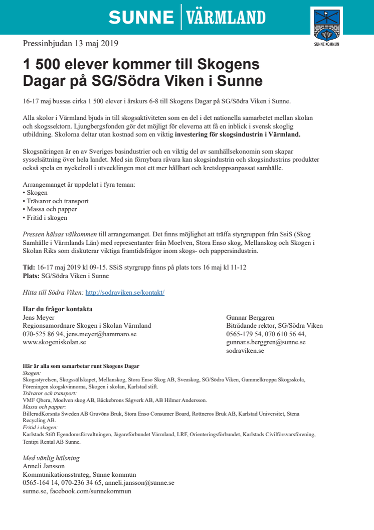 16-17 maj bussas cirka 1 500 elever i årskurs 6-8 till Skogens Dagar på SG/Södra Viken i Sunne.