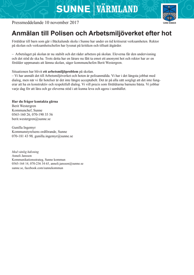 Arbetslaget på Bäckalunds skola i Sunne är nu stabilt och det råder arbetsro på skolan. Eleverna får den undervisning och det stöd de ska ha. Trots de åtgärder som satts in har en lärare nu fått ta emot ett anonymt hot och rektor har av en förälder uppmanats att lämna skolan. Situationen har blivit ett arbetsmiljöproblem på skolan vilket anmälts till Arbetsmiljöverket. Hoten är polisanmälda.