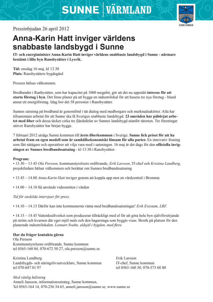 IT- och energiminister Anna-Karin Hatt inviger världens snabbaste landsbygd i Sunne, Värmland - närmare bestämt i lilla byn Ransbysätter i Lysvik. 16 maj kl 13.30 sker den officiella invigningen av den unika bredbandssatsningen.
