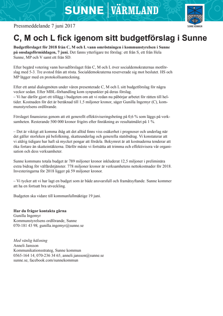 Budgetförslaget för 2018 från C, M och L vann omröstningen i kommunstyrelsen i Sunne på onsdagsförmiddagen, 7 juni. Det fanns ytterligare tre förslag: ett från S, ett från Hela Sunne, MP och V samt ett från SD.