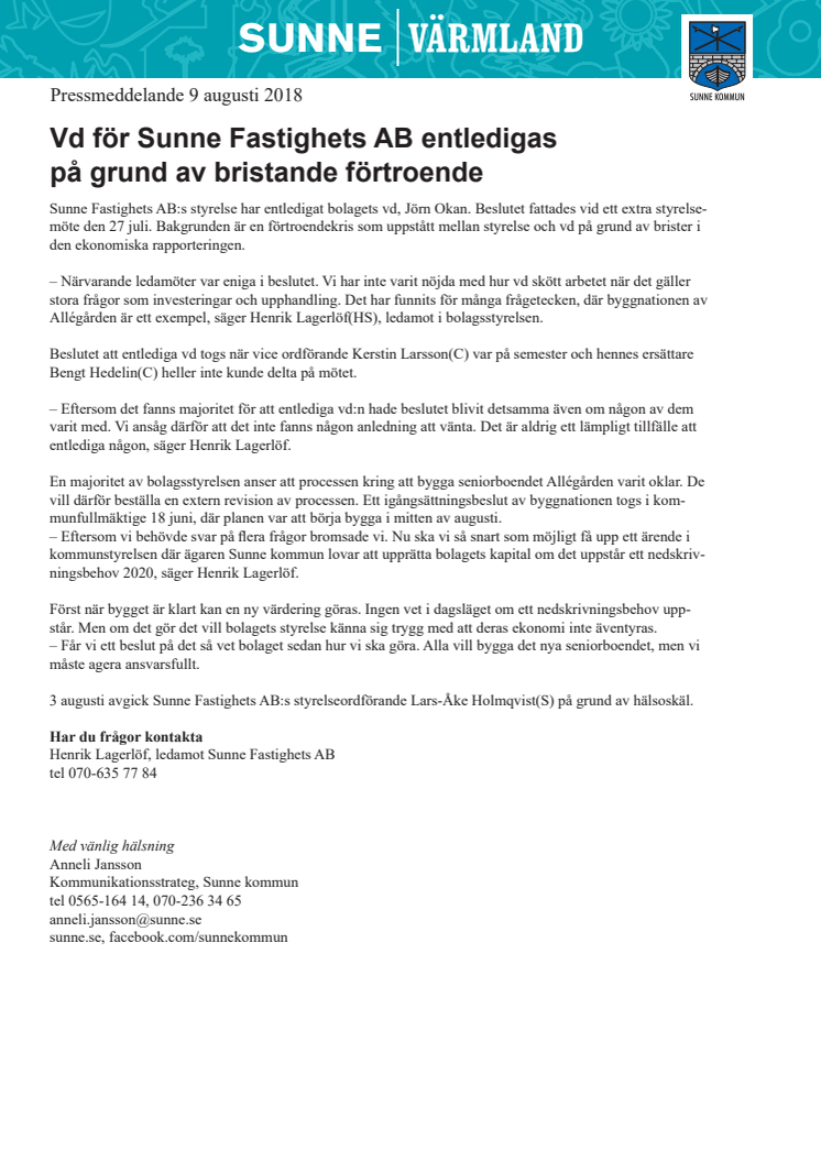Sunne Fastighets AB:s styrelse har entledigat bolagets vd, Jörn Okan. Beslutet fattades vid ett extra styrelsemöte den 27 juli. Bakgrunden är en förtroendekris som uppstått mellan styrelse och vd på grund av brister i den ekonomiska rapporteringen. En majoritet av bolagsstyrelsen anser att processen kring seniorboendet Allégården varit oklar. De vill därför beställa en extern revision av den.