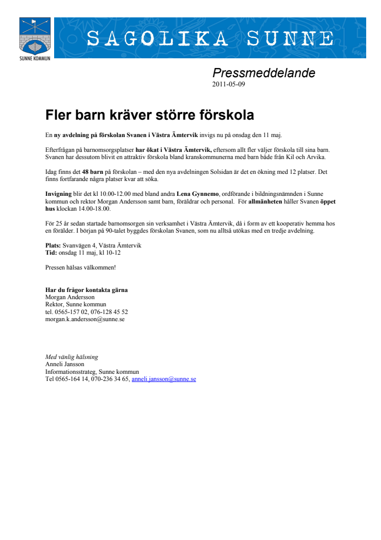 Efterfrågan på barnomsorgsplatser i Västra Ämtervik ökar. Därför invigs en ny avdelning med 12 platser på förskolan Svanen. Förskolan har också blivit attraktiv bland kranskommunerna med barn från både Kil och Arvika.