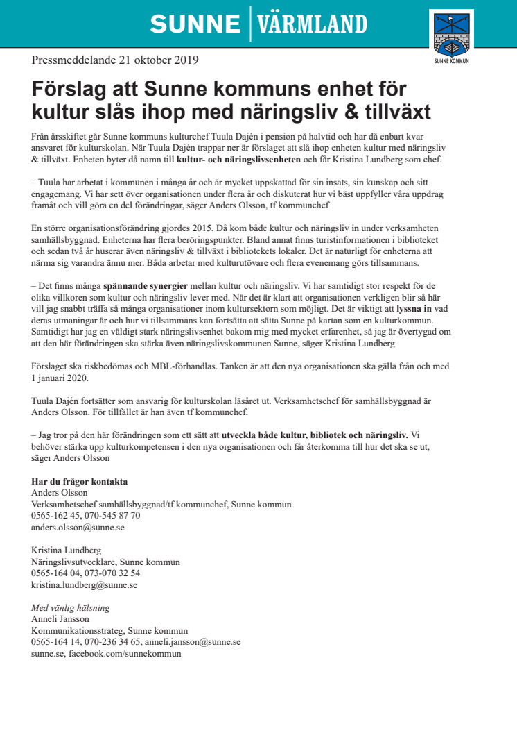 Från årsskiftet går Sunne kommuns kulturchef Tuula Dajén i pension på halvtid och har då enbart kvar ansvaret för kulturskolan. När Tuula Dajén trappar ner är förslaget att slå ihop enheten kultur med näringsliv & tillväxt. Enheten byter då namn till kultur- och näringslivsenheten och får Kristina Lundberg som chef.