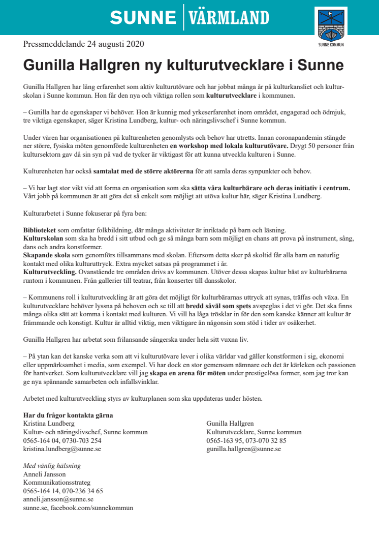 Gunilla Hallgren har lång erfarenhet som aktiv kulturutövare och har jobbat många år på kulturkansliet och kulturskolan i Sunne kommun. Hon får den nya och viktiga rollen som kulturutvecklare i kommunen. Stor vikt har lagts vid att forma en organisation som ska sätta Sunnes kulturbärare i centrum. Kommunens jobb är att göra det så enkelt som möjligt att utöva kultur i Sunne.