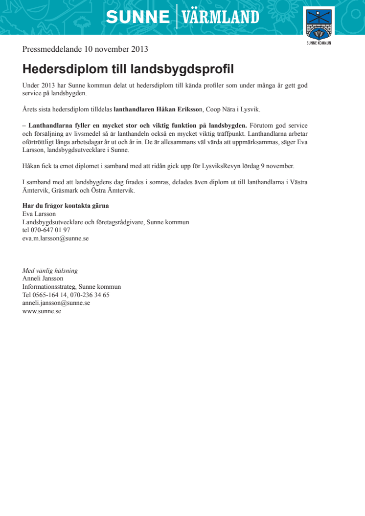 Lanthandlaren Håkan Eriksson, Coop Nära i Lysvik, har tilldelats Sunne kommuns hedersdiplom för att under många år ha gett god service på landsbygden.