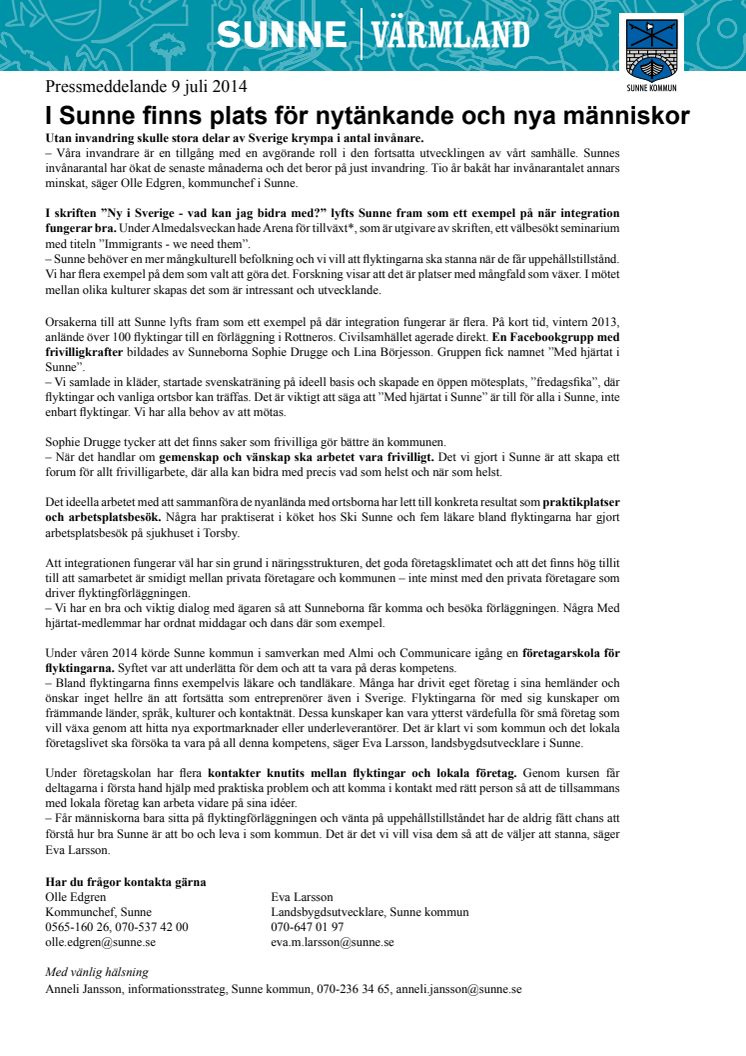 – Våra invandrare är en tillgång med en avgörande roll i den fortsatta utvecklingen av vårt samhälle. Sunnes invånarantal har ökat de senaste månaderna och det beror på just invandring. Tio år bakåt har invånarantalet annars minskat, säger Olle Edgren, kommunchef i Sunne
