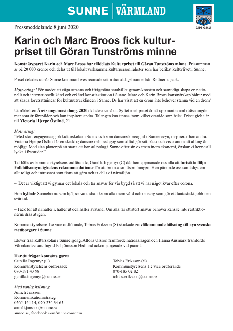 Konstnärsparet Karin och Marc Broos har tilldelats Kulturpriset till Göran Tunströms minne. Prissumman är på 20 000 kronor och delas ut till lokalt verksamma kulturpersonligheter som har berikat kulturlivet i Sunne.