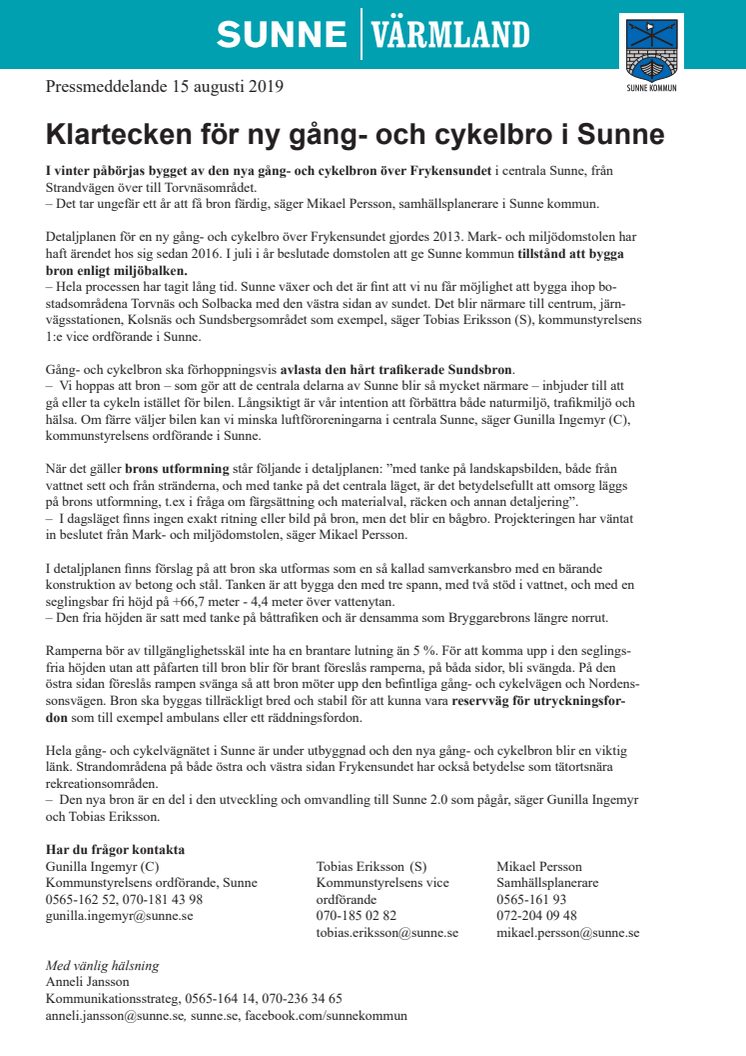 Klartecken för ny gång- och cykelbro i Sunne