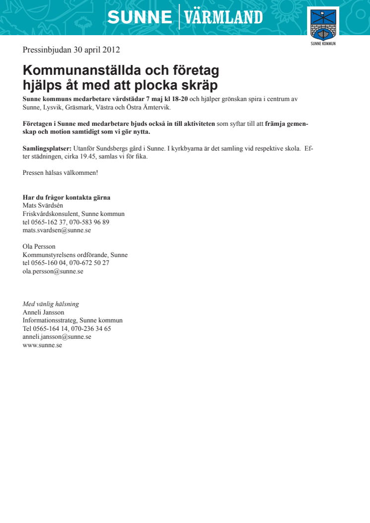 Sunne kommuns medarbetare plockar skräp för att få grönskan att spira. Företagen bjud också in till aktiviteten den 7 maj kl 18-20.