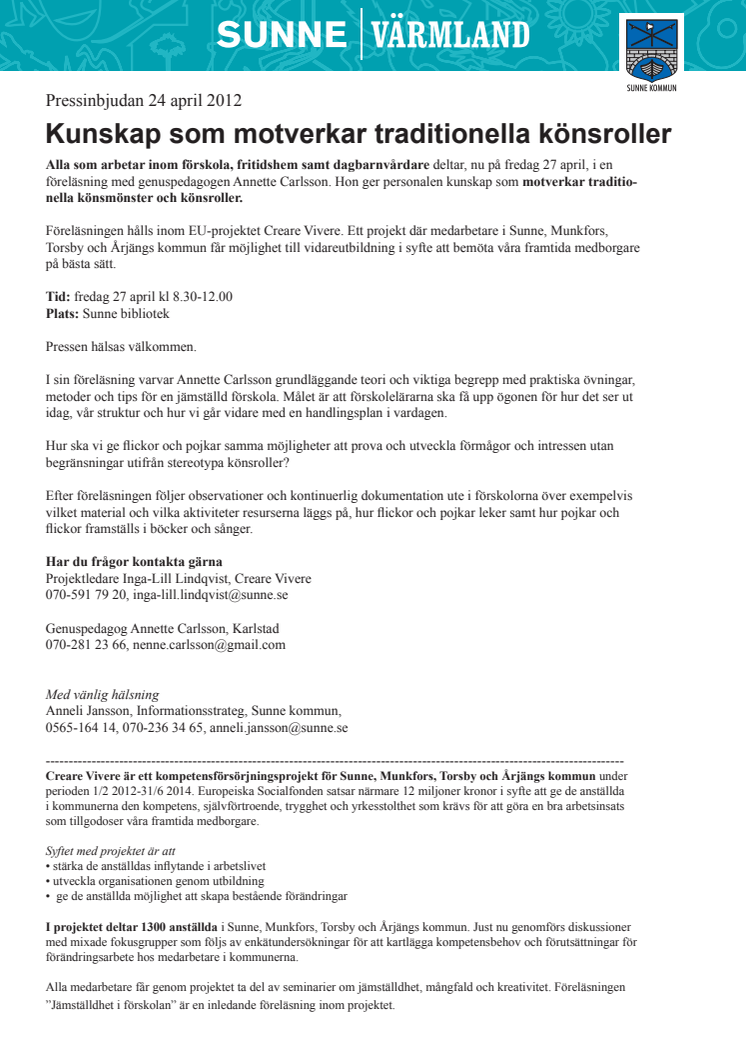 Alla som arbetar i förskola, fritidshem samt dagbarnvårdare deltar, fredag 27 april, i en föreläsning med genuspedagogen Annette Carlsson. Hon ger personalen kunskap som motverkar traditionella könsroller. Föreläsningen hålls inom EU-projektet Creare Vivere. Medarbetare i Sunne, Munkfors, Torsby och Årjängs kommun får vidareutbildning i syfte att bemöta våra framtida medborgare på bästa sätt.