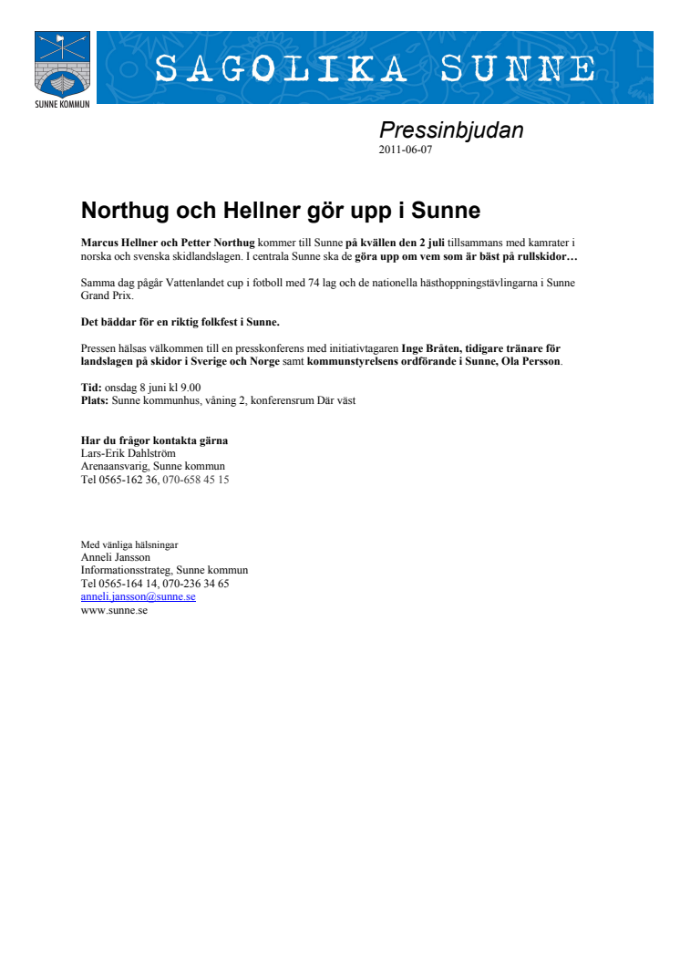 Marcus Hellner och Petter Northug kommer till Sunne den 2 juli och gör upp om vem som är bäst på rullskidor tillsammans med kamrater i norska och svenska skidlandslagen. Det bäddar för folkfest i Sunne.