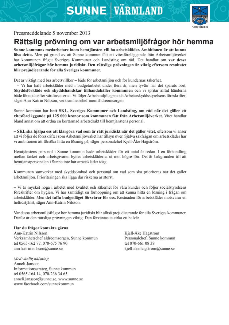 Hemtjänstpersonalen i Sunne kommun vill ha arbetskläder. Ambitionen är att kunna lösa detta. Men på grund av att Sunne kommun fått ett vitesföreläggande från Arbetsmiljöverket har kommunen frågat Sveriges Kommuner och Landsting om råd. Det handlar om var dessa arbetsmiljöfrågor hör hemma juridiskt. Den rättsliga prövningen är viktig eftersom resultatet blir prejudicerande för Sveriges kommuner.