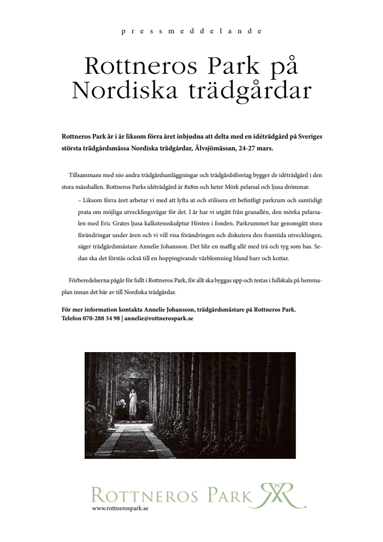 Rottneros Park är i år liksom förra året inbjudna att delta med en idéträdgård på Sveriges största trädgårdsmässa Nordiska trädgårdar, Älvsjömässan, 24-27 mars.