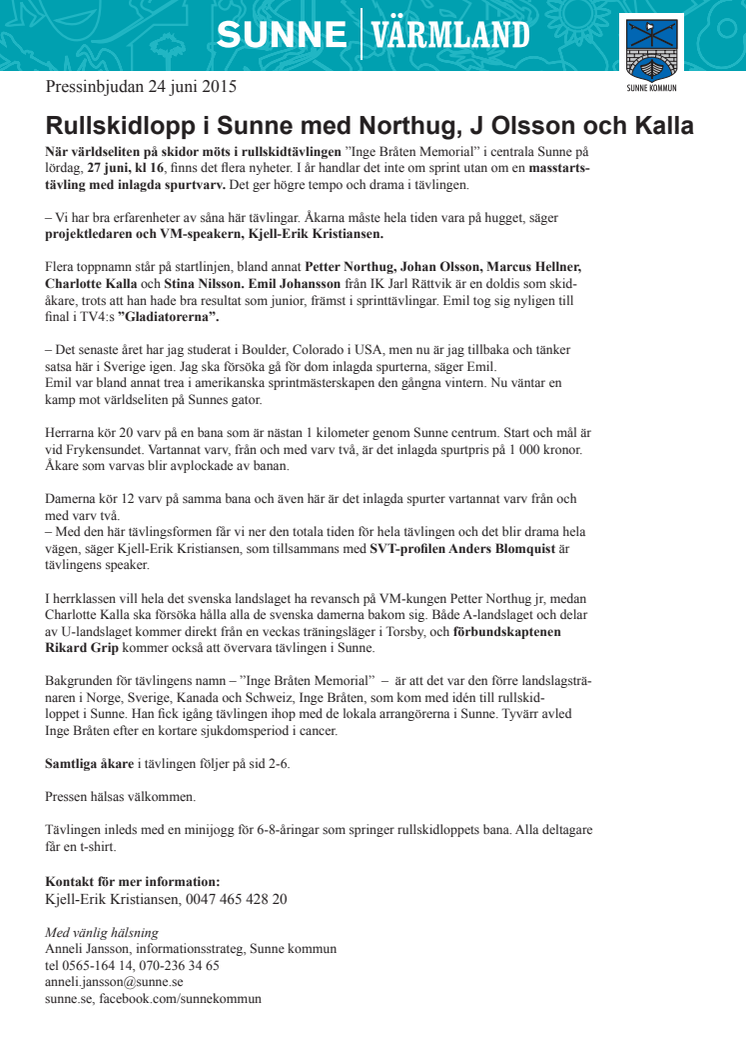 När världseliten på skidor möts i rullskidtävlingen "Inge Bråten Memorial" i centrala Sunne på lördag, 27 juni, kl 16, blir det i högt tempo. Flera toppnamn står på startlinjen, bland annat Petter Northug, Johan Olsson, Marcus Hellner, Charlotte Kalla och Stina Nilsson. Emil Johansson från IK Jarl Rättvik är en doldis som skidåkare, men tog sig nyligen till final i TV4:s "Gladiatorerna".