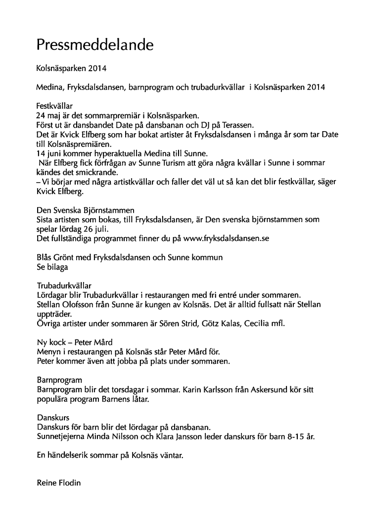 Medina, Fryksdalsdansen, barnprogram och trubadurkvällar i Kolsnäsparken 2014.