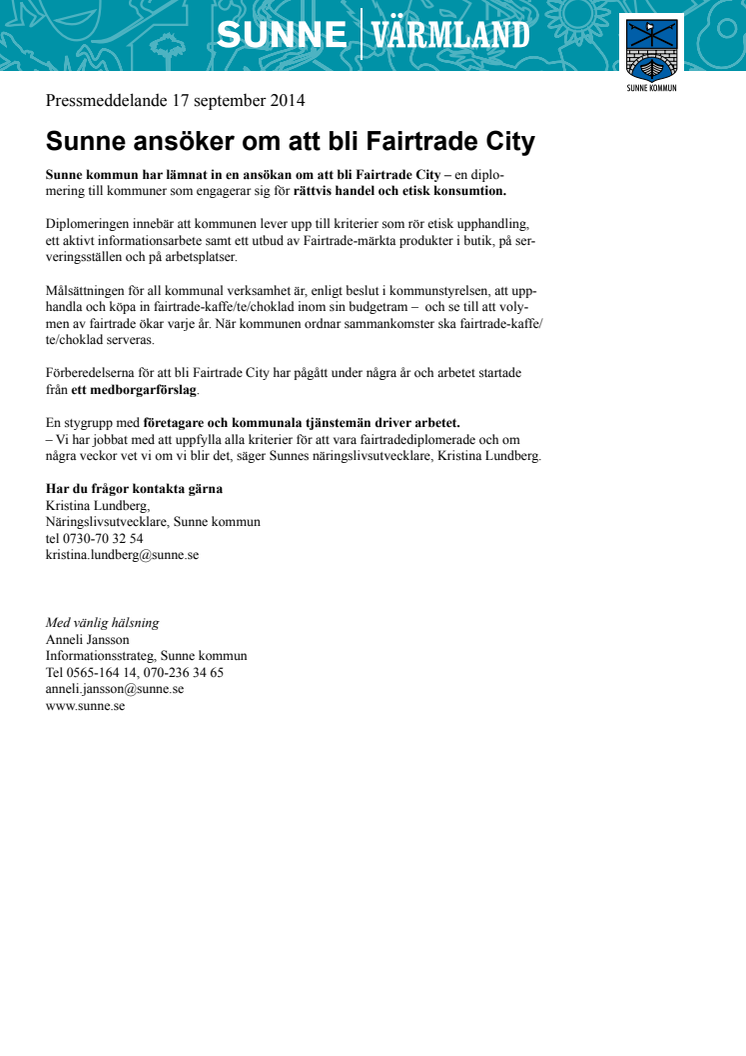 Sunne kommun har lämnat in en ansökan om att bli Fairtrade City – en diplomering till kommuner som engagerar sig för rättvis handel och etisk konsumtion. Arbetet startade från ett medborgarförslag och det drivs av en stygrupp med företagare och kommunala tjänstemän.
