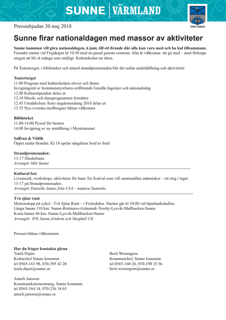 Sunne kommun vill göra nationaldagen, 6 juni, till ett firande där alla kan vara med och ha kul tillsammans. Firandet startar med en parad genom centrum. Alla är välkomna att gå med – med förhoppningen att bli så många som möjligt. På Teatertorget, i biblioteket och utmed strandpromenaden blir det sedan underhållning och aktiviteter hela dagen. På kvällen spelar Soul to Soul på Saffran & Vitlök.