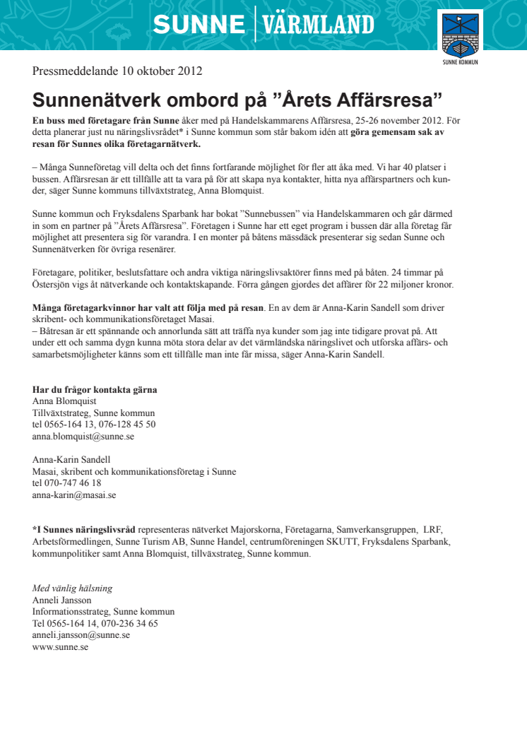 En buss med företagare från Sunne åker med på Handelskammarens Affärsresa, 25-26 november 2012. För detta planerar just nu näringslivsrådet i Sunne kommun som står bakom idén att göra gemensam sak av resan för Sunnes olika företagarnätverk.