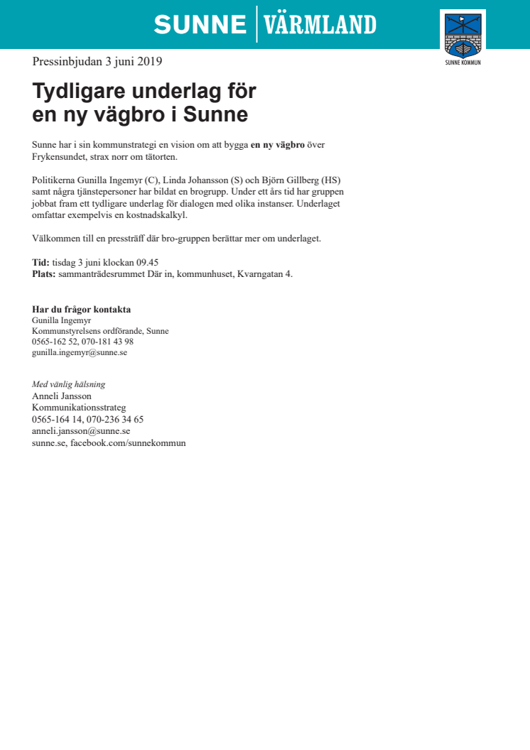 Sunne har i sin kommunstrategi en vision om att bygga en ny vägbro över Frykensundet, strax norr om tätorten. Under ett års tid har en brogrupp jobbat fram ett tydligare underlag för dialogen med olika instanser. Underlaget omfattar exempelvis en kostnadskalkyl. Välkommen till en pressträff där bro-gruppen berättar mer om underlaget.