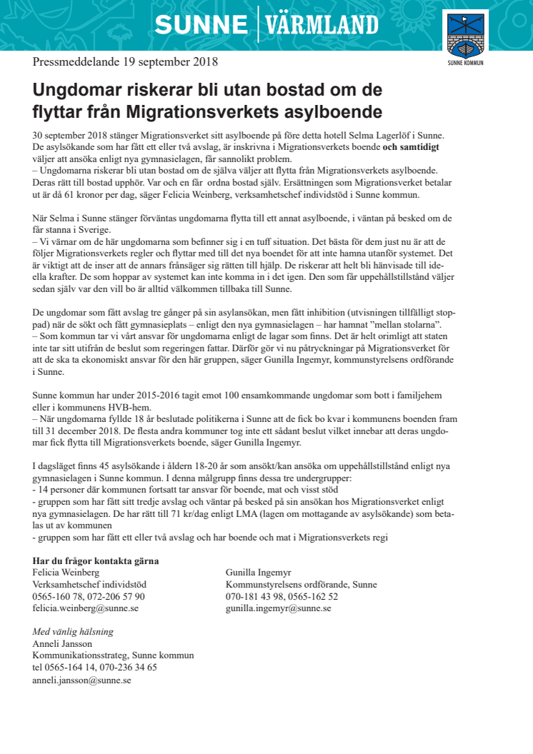 När asylboendet Selma i Sunne stänger förväntas ungdomarna flytta till ett annat asylboende, i väntan på besked om de får stanna i Sverige. "Det bästa för dem just nu är att flytta med till Migrationsverkets nya boende för att inte hamna utanför systemet. Det är viktigt att de inser att de annars frånsäger sig rätten till hjälp. De som hoppar av systemet kan inte komma in i det igen".