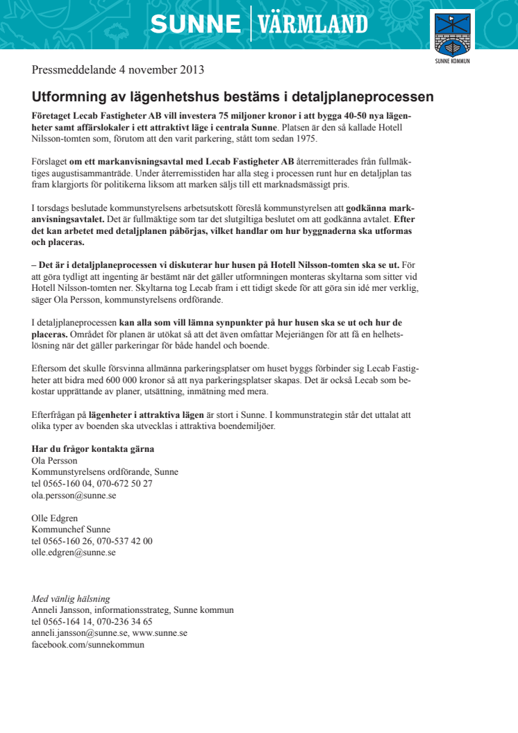 I torsdags beslutade kommunstyrelsens arbetsutskott föreslå kommunstyrelsen i Sunne att godkänna markanvisningsavtalet för Hotell Nilsson-tomten. Där vill Lecab Fastigheter bygga lägenheter. Det är fullmäktige som tar det slutgiltiga beslutet om att godkänna avtalet. Efter det kan arbetet med detaljplanen påbörjas, vilket handlar om hur byggnaderna ska utformas och placeras.
