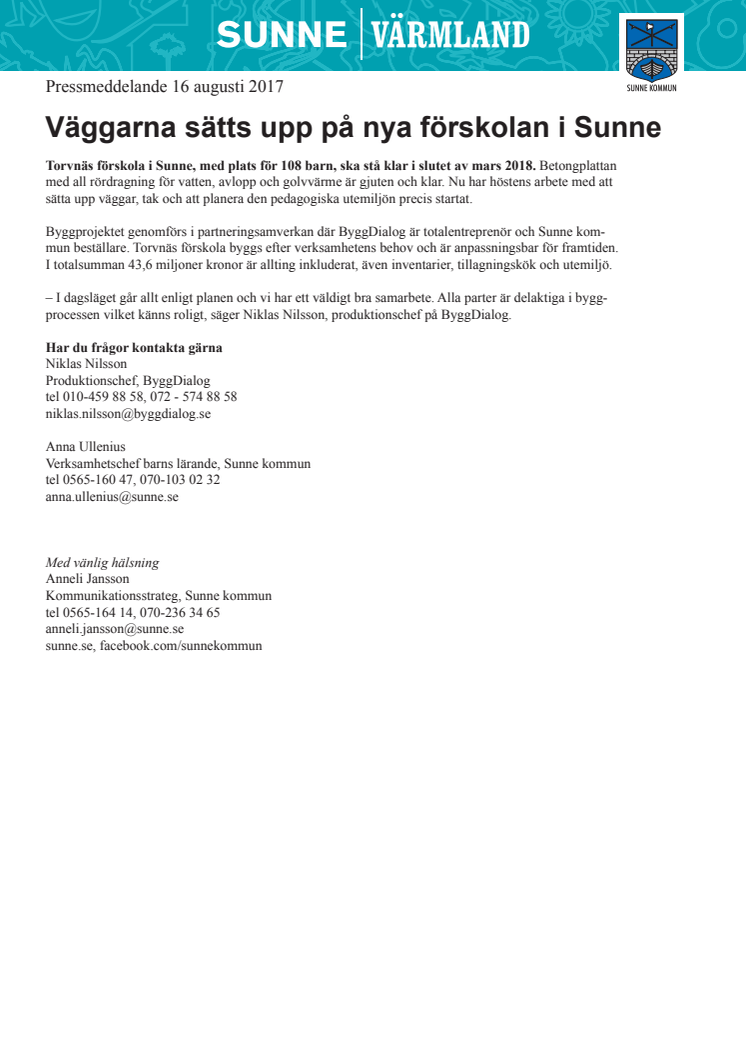 Torvnäs förskola i Sunne, med plats för 108 barn, ska stå klar i slutet av mars 2018. Betongplattan med all rördragning för vatten, avlopp och golvvärme är gjuten och klar. Nu har höstens arbete med att sätta upp väggar, tak och att planera den pedagogiska utemiljön precis startat.