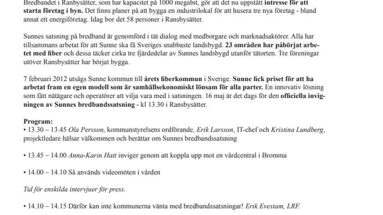 7 februari 2012 utsågs Sunne kommun till årets fiberkommun i Sverige. Sunne fick priset för att ha arbetat fram en egen modell som är samhällsekonomiskt lönsam för alla parter. En innovativ lösning som fått nätägare och operatörer att vilja vara med i satsningen. 16 maj är det dags för den officiella invigningen av Sunnes bredbandssatsning - kl 13.30 i Ransbysätter.