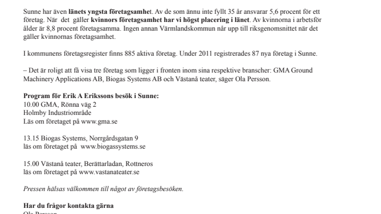 – Han vill lära sig mer om Sunnes näringsliv och om kommunens framgångsrika näringslivsarbete, eftersom vi haft Värmlands bästa företagsklimat under många år. 2012 ligger vi på 24:e plats i Sverige enligt Svenskt näringslivs undersökning, säger kommunstyrelsens ordförande, Ola Persson.