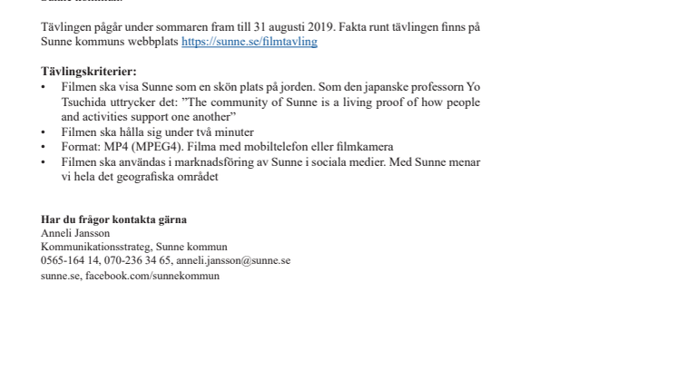 Tävlingen pågår under sommaren fram till 31 augusti 2019. Fakta runt tävlingen finns på Sunne kommuns webbplats Fakta om filmtävlingen