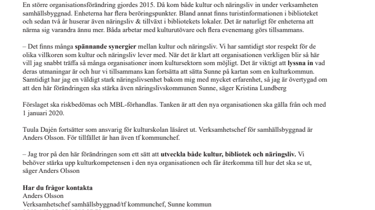 Från årsskiftet går Sunne kommuns kulturchef Tuula Dajén i pension på halvtid och har då enbart kvar ansvaret för kulturskolan. När Tuula Dajén trappar ner är förslaget att slå ihop enheten kultur med näringsliv & tillväxt. Enheten byter då namn till kultur- och näringslivsenheten och får Kristina Lundberg som chef.