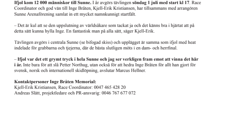 Ifjol kom 12 000 människor till Sunne. I år avgörs tävlingen söndag 1 juli med start kl 17. Race Coordinator och god vän till Inge Bråten, Kjell-Erik Kristiansen, har tillsammans med arrangören Sunne Arenaförening samlat in ett mycket namnkunnigt startfält.