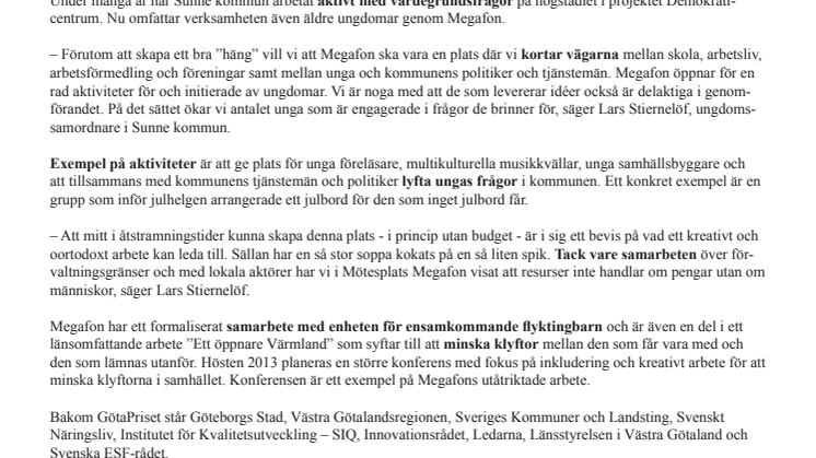 – Förutom att skapa ett bra "häng" vill vi att Megafon ska vara en plats där vi kortar vägarna mellan skola, arbetsliv, arbetsförmedling och föreningar samt mellan unga och kommunens politiker och tjänstemän. Megafon öppnar för en rad aktiviteter för och initierade av ungdomar. Vi är noga med att de som levererar idéer också är delaktiga i genomförandet. På det sättet ökar vi antalet unga som är engagerade i frågor de brinner för, säger Lars Stiernelöf, ungdomssamordnare i Sunne kommun.