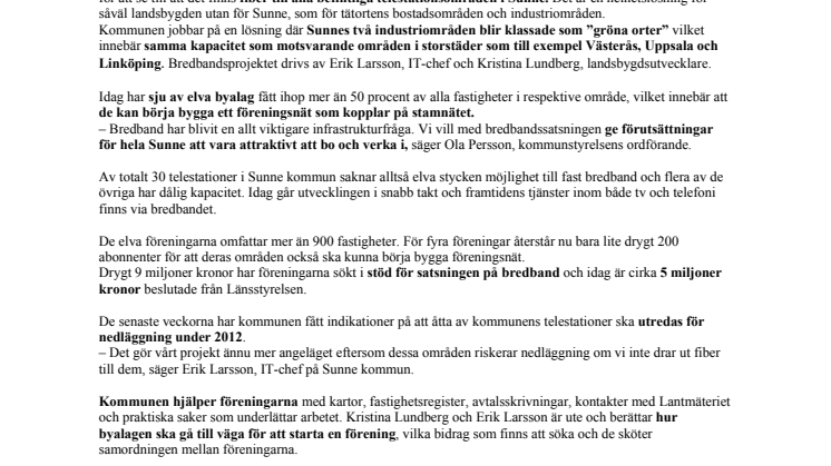 Kommunen jobbar på en lösning där Sunnes två industriområden blir klassade som ”gröna orter” vilket innebär samma kapacitet som motsvarande områden i storstäder som till exempel Västerås, Uppsala och Linköping. Bredbandsprojektet drivs av Erik Larsson, IT-chef och Kristina Lundberg, landsbygdsutvecklare.