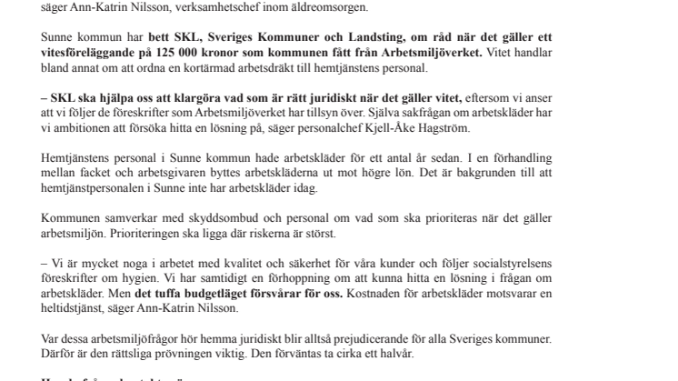 Sunne kommuns medarbetare inom hemtjänsten vill ha arbetskläder. Ambitionen är att kunna lösa detta. Men på grund av att Sunne kommun fått ett vitesföreläggande från Arbetsmiljöverket har kommunen frågat Sveriges Kommuner och Landsting om råd. Det handlar om var dessa arbetsmiljöfrågor hör hemma juridiskt. Den rättsliga prövningen är viktig, eftersom resultatet blir prejudicerande för alla Sveriges kommuner.