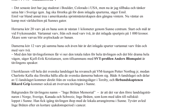 När världseliten på skidor möts i rullskidtävlingen "Inge Bråten Memorial" i centrala Sunne på lördag, 27 juni, kl 16, finns det flera nyheter. I år handlar det inte om sprint utan om en masstartstävling med inlagda spurtvarv. Det ger högre tempo och drama i tävlingen.