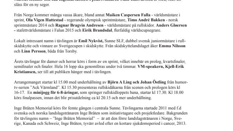 Världseliten på skidor möts i rullskidtävlingen "Inge Bråten Memorial" i centrala Sunne, lördag, 2 juli. Nytt för i år är att tävlingarna tv-sänds live under två timmar, både i svensk och norsk tv – TV12 respektive norska TV2 Sportkanalen.