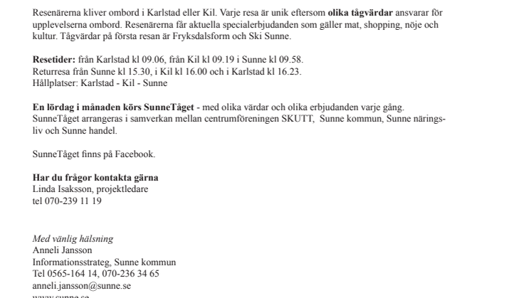 Lördag 2 mars går startskottet för nya satsningen SunneTåget. Resan är gratis, men för att vara säker på att komma med så måste plats bokas på www.sunne.se/sunnetaget Den som vill kliva på i Kil, anger det vid anmälan.