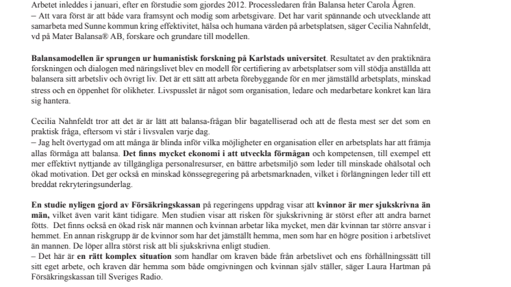 – Att vara först är att både vara framsynt och modig som arbetsgivare. Det har varit spännande och utvecklande att samarbeta med Sunne kommun kring effektivitet, hälsa och humana värden på arbetsplatsen, säger Cecilia Nahnfeldt, vd på Mater Balansa® AB, forskare och grundare till modellen.