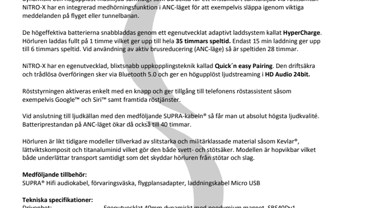 NiTRO-X är en ny trådlös och brusreducerande over-ear hörlur med komfort och passform i världsklass, tack vare gyroskopfunktion och materialval. Batteritiden är hela 35 timmar och hörluren har en snabbladdningsfunktion vilket ger 6 timmars speltid på bara på 15 minuters laddning.