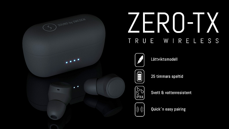 ZERO-TX är en ny stilren TWS hörlur med total speltid på +25 timmar och en vikt på endast 3.9 gram. Hörluren är svett- och vattenresistent och certifierad enligt kapslingsklass IPX4.