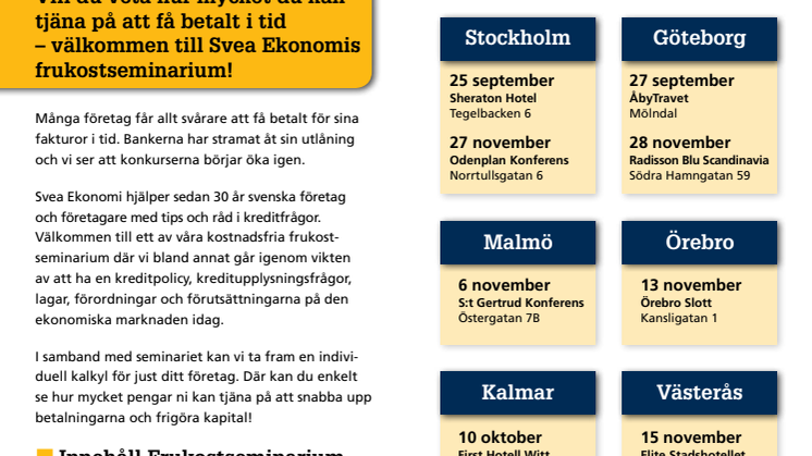Många företag får allt svårare att få betalt för sina fakturor i tid. Bankerna har stramat åt sin utlåning och vi ser att konkurserna börjar öka igen. Svea Ekonomi hjälper sedan 30 år svenska företag och företagare med tips och råd i kreditfrågor. På vårt frukostseminarium går vi bland annat igenom vikten av att ha en kreditpolicy, kreditupplysningsfrågor, lagar, förordningar och förutsättningarna på den ekonomiska marknaden idag.