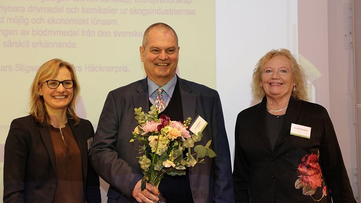 Karin Medin, ordförande i Svebio och Cecilia Häckner, Jan Häckners dotter, överlämnade idag Jan Häckners bioenergistipendium till Lars Stigsson innovatör och grundare av SunPine i Piteå. Priset delades ut vid Svebios årsmöte den 10 april. Stipendiet består av 10 000 kronor och delas varje år ut till en person som genom forskning, innovation eller företagsutveckling gjort en betydelsefull insats för att främja ökad bioenergianvändning på ett miljövänligt sätt.