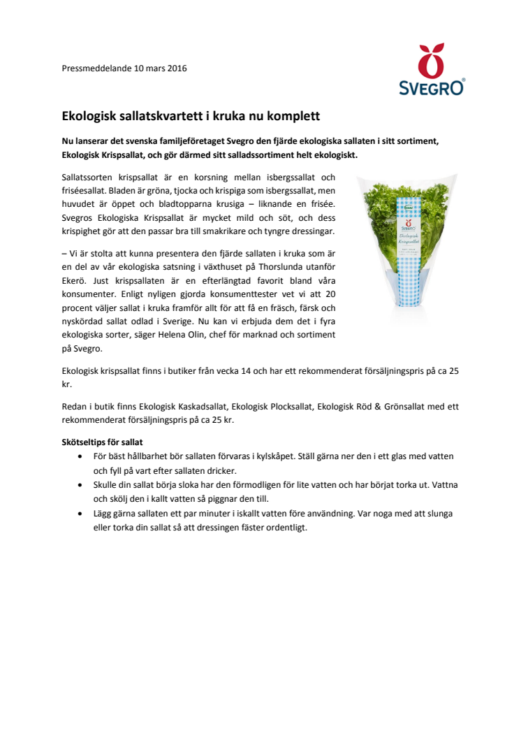 Nu lanserar det svenska familjeföretaget Svegro den fjärde ekologiska sallaten i sitt sortiment, Ekologisk Krispsallat, och gör därmed sitt salladssortiment helt ekologiskt.