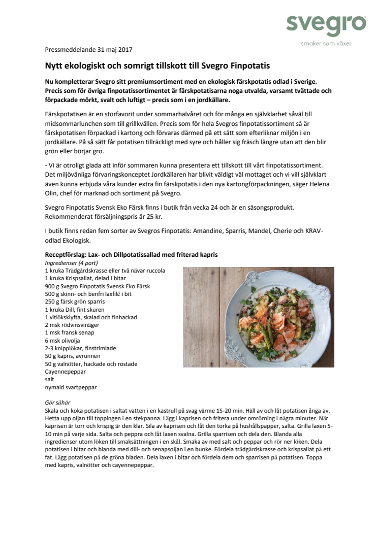 Nu kompletterar Svegro sitt premiumsortiment med en ekologisk färskpotatis odlad i Sverige. Precis som för övriga finpotatissortimentet är färskpotatisarna noga utvalda, varsamt tvättade och förpackade mörkt, svalt och luftigt – precis som i en jordkällare.