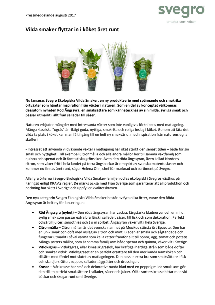 Nu lanseras Svegro Ekologiska Vilda Smaker, en ny produktserie med spännande och smakrika örtväxter som hämtar inspiration från växter i naturen. Som en del av konceptet välkomnas dessutom nyheten Röd Ängssyra, en smaksättare som kännetecknas av sin milda, syrliga smak och passar utmärkt i allt från sallader till såser.