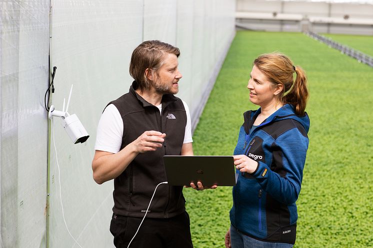 Erik Fredlund, AI-konsult Codon Consulting och Lisa Lindström, odlingschef Svegro installerar framtidens odling.