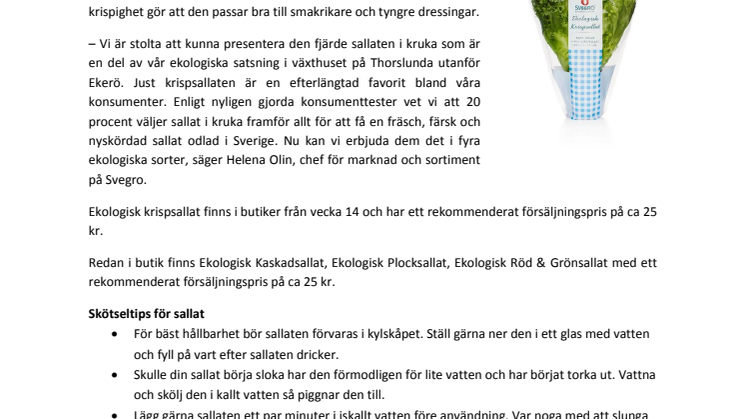 – Vi är stolta att kunna presentera den fjärde sallaten i kruka som är en del av vår ekologiska satsning i växthuset på Thorslunda utanför Ekerö. Just krispsallaten är en efterlängtad favorit bland våra konsumenter. Enligt nyligen gjorda konsumenttester vet vi att 20 procent väljer sallat i kruka framför allt för att få en fräsch, färsk och nyskördad sallat odlad i Sverige. Nu kan vi erbjuda dem det i fyra ekologiska sorter, säger Helena Olin, chef för marknad och sortiment på Svegro.