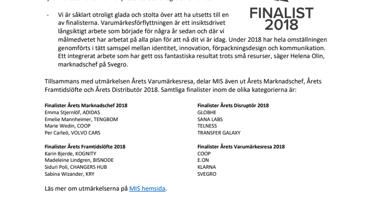 Tillsammans med utmärkelsen Årets Varumärkesresa, delar MIS även ut Årets Marknadschef, Årets Framtidslöfte och Årets Distributör 2018. Samtliga finalister inom de olika kategorierna är: